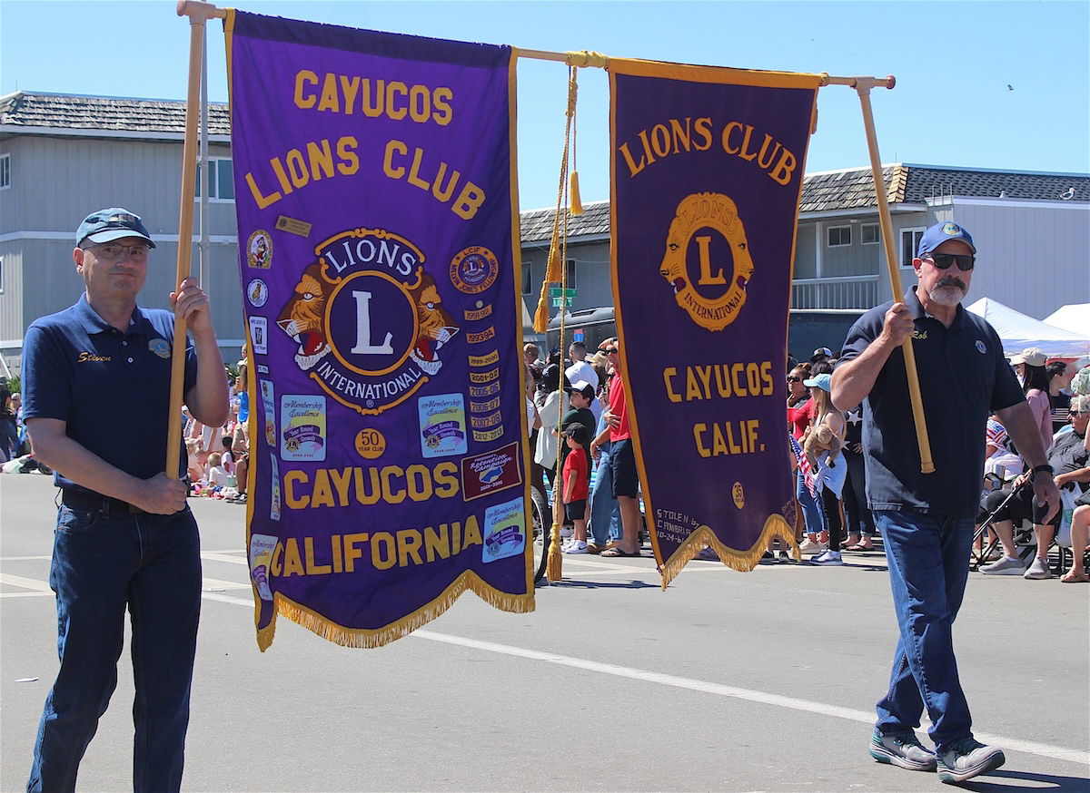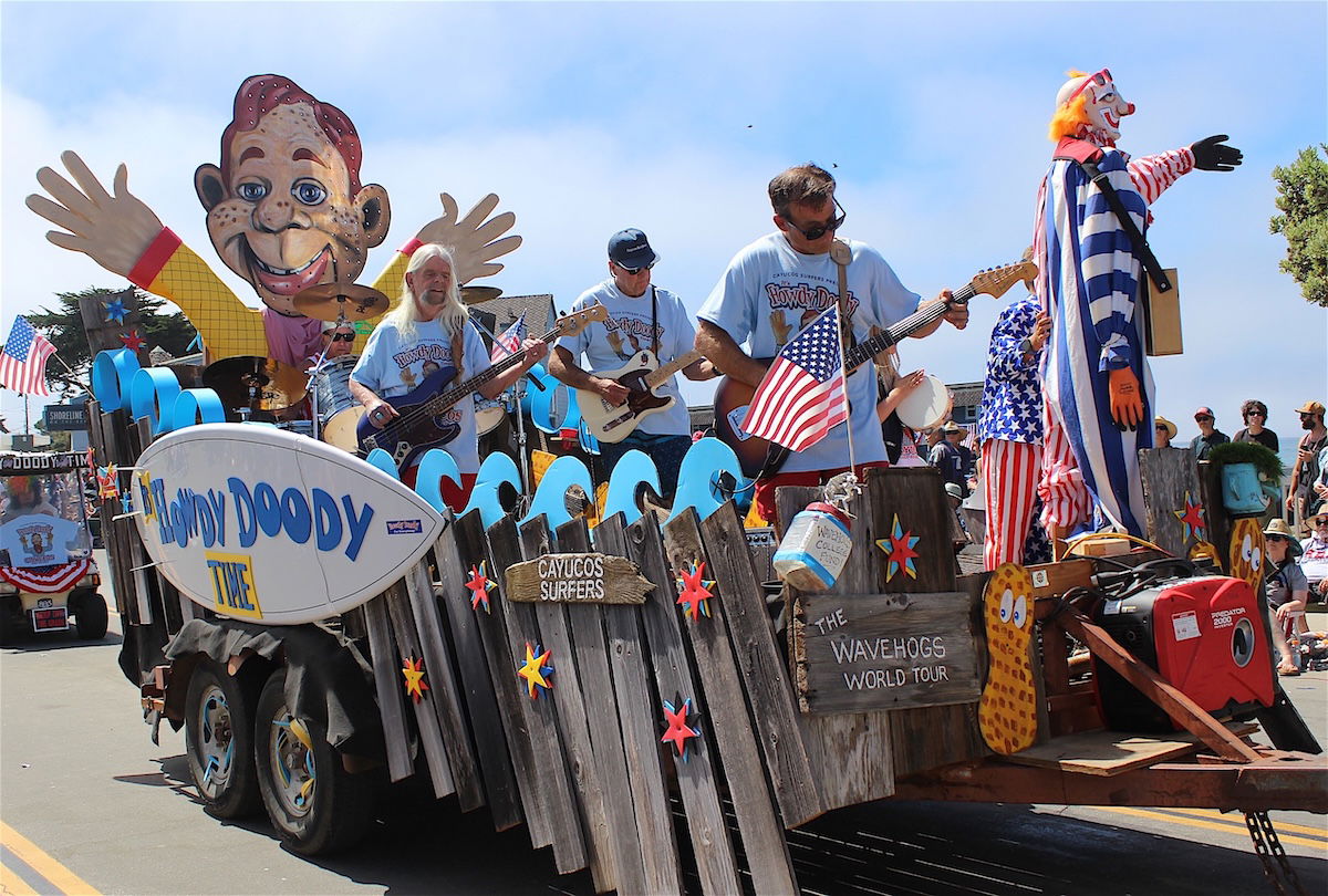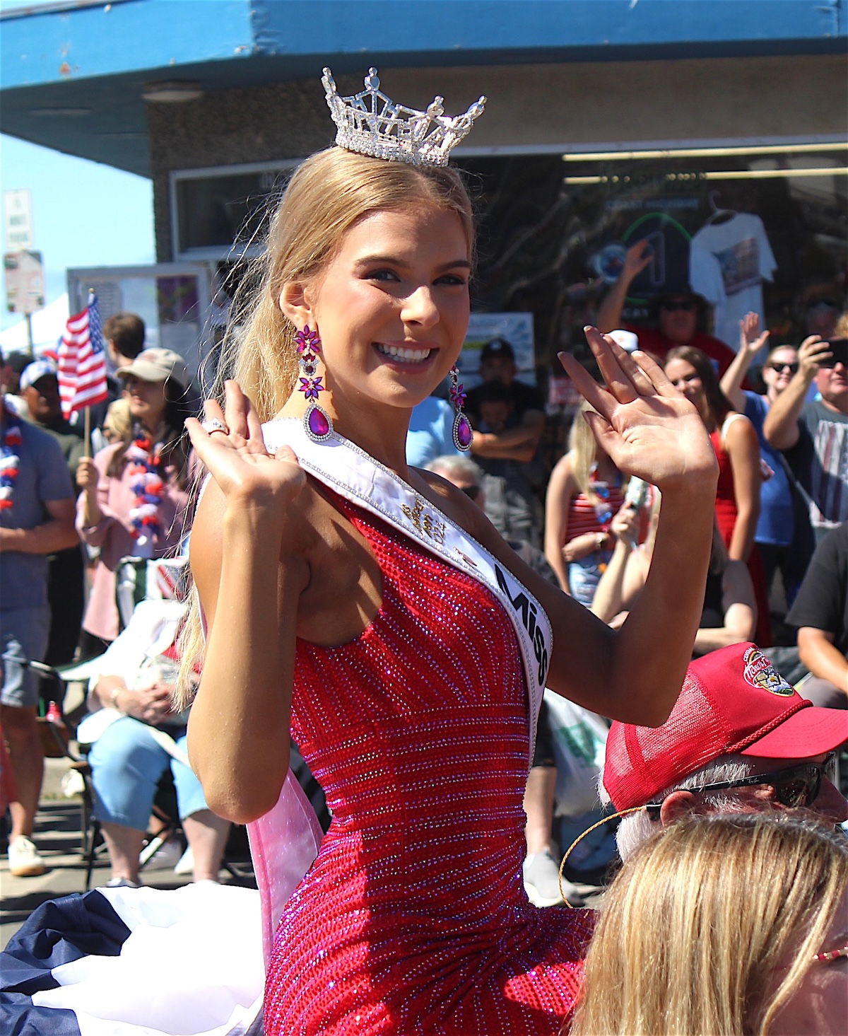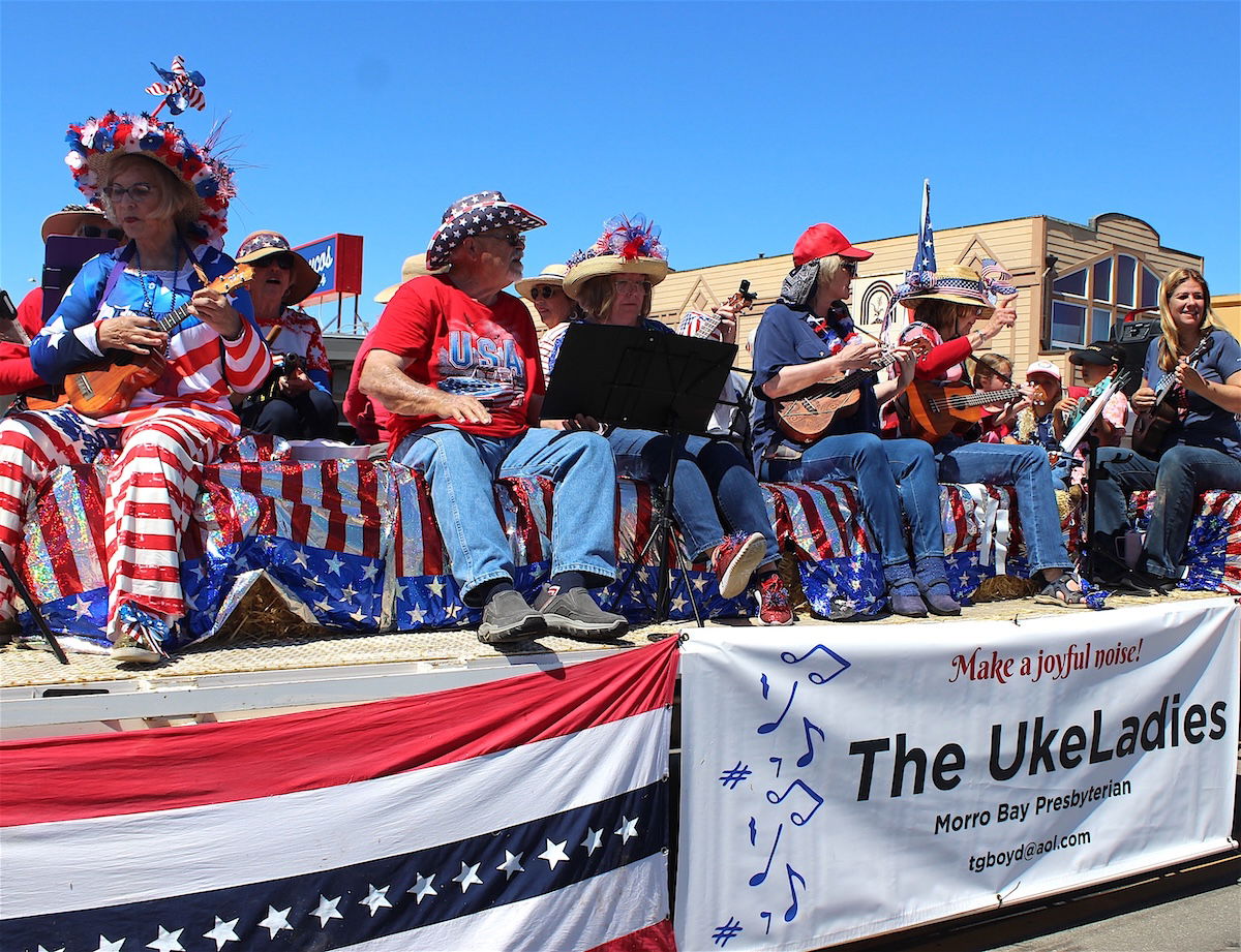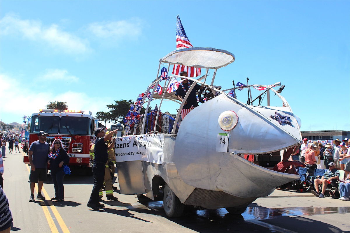 An estimated 22,000 people turned out on the 4th of July for the Annual Lions Club Independence Day Parade. And while the day dawned beautiful and sunny, the normal fog rolled in to cool things off a bit. Cool off, that is, except for the fish mobile entry by the Cayucos Citizens Advisory Council, which had a rock 'n' roll band with Billy Foppiano playing surf music until the custom-built boat that looks like an albacore tuna caught fire and was disabled. Volunteers from the crowd jumped to the rescue and pushed the car along the parade route until the fire chief hooked up a tow strap and towed the car like a [giant] fish out of water. Among the entries was Miss California Teen USA Paige Gonor, who sang the national anthem for the crowd when she reached the judge's stand.