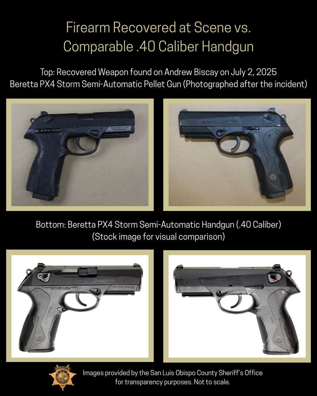 LOS OSOS — The San Luis Obispo County Sheriff’s Office has identified the man killed in a deputy-involved shooting early Wednesday morning in Los Osos as 40-year-old Andrew Biscay of Chowchilla. Authorities say Biscay exited his vehicle and pointed a handgun at deputies, prompting them to open fire. A pellet gun resembling a real firearm was recovered at the scene.