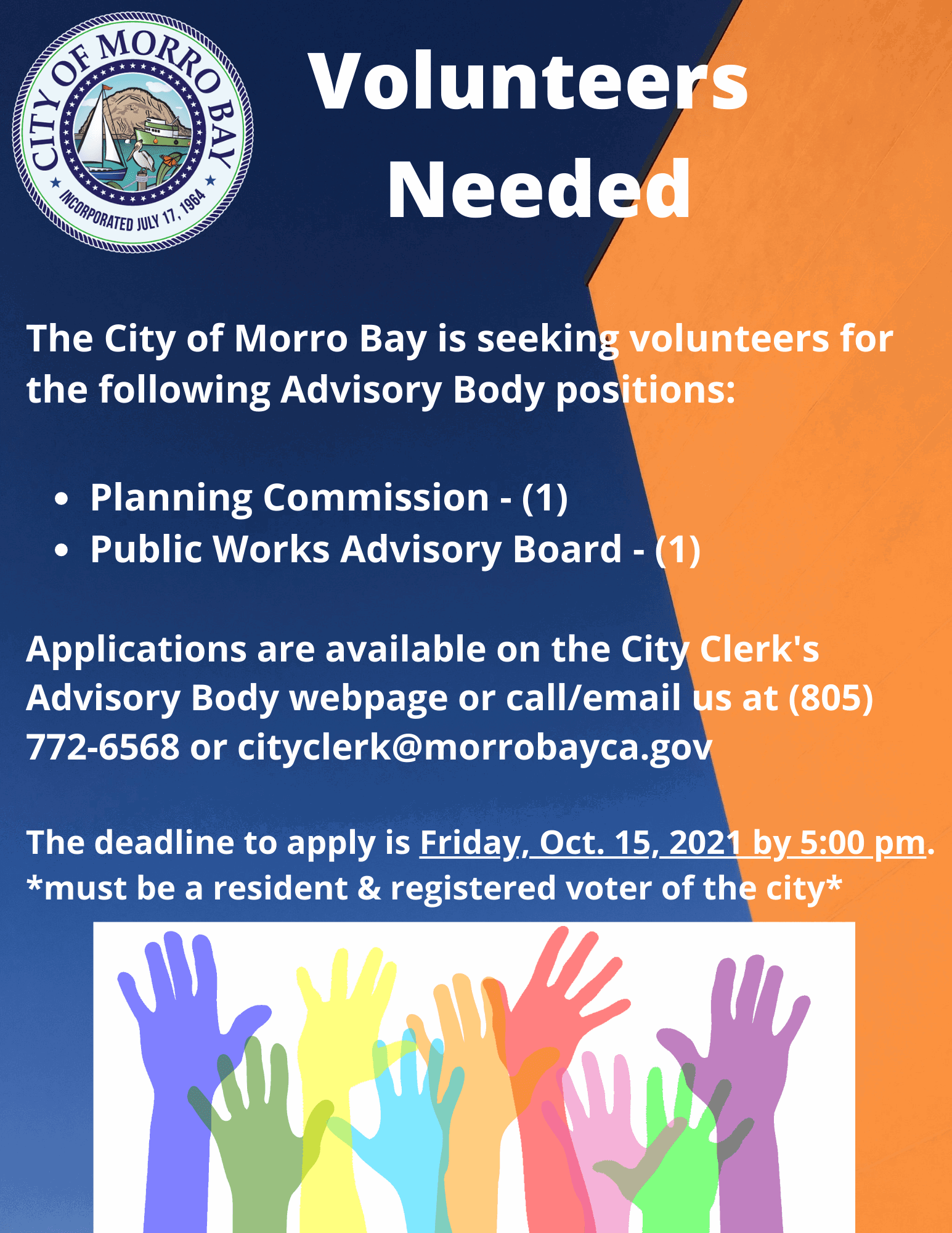 Applications are available on the City Clerk’s webpage. The application deadline to apply is on Friday, Oct. 15, 5 p.m. Completed applications can be emailed, mailed, or returned at the drop box located at City Hall. Learn more by visiting morrobayca.gov/advisorybody