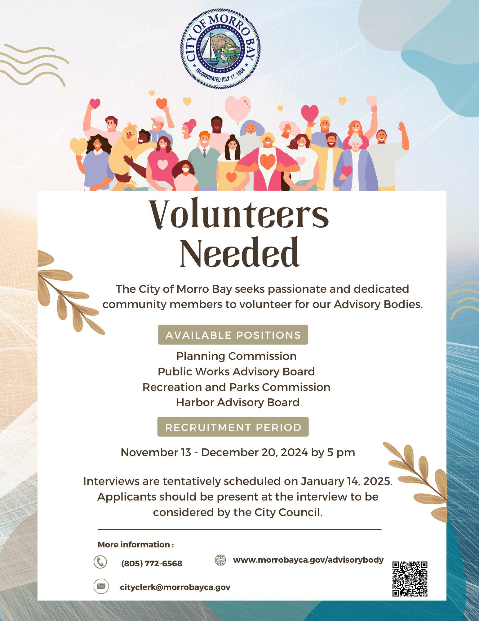 The City of Morro Bay is now accepting applications to fill current and upcoming vacancies on its Advisory Bodies for 2025. Residents passionate about serving their community are encouraged to apply and contribute to shaping the city’s future.