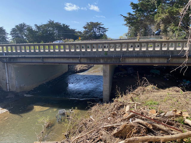 The creek, when it reaches Main Street, goes under a series of road bridges starting at Main Street and including the Highway 1 bridges. In 1995, debris and a tree that had eroded into the creek from upstream got stuck at the Main Street Bridge, causing the water to back up and flood the area.