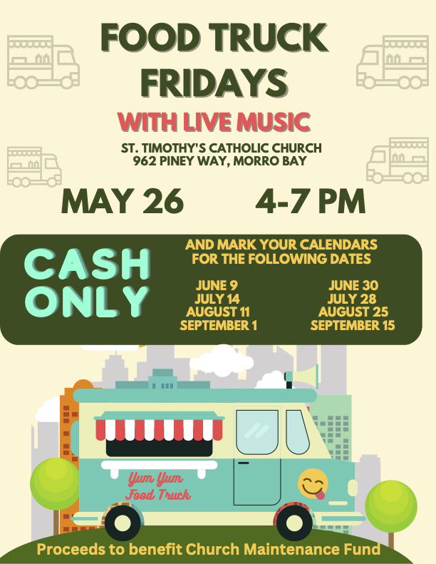 MORRO BAY — St. Timothy's Catholic Church is hosting a series of nine food truck events at 962 Piney Way. Mark your calendars for these dates: June 9, June 30, July 14, July 28, Aug. 11, Aug. 25, Sept. 1, and Sept. 15.
