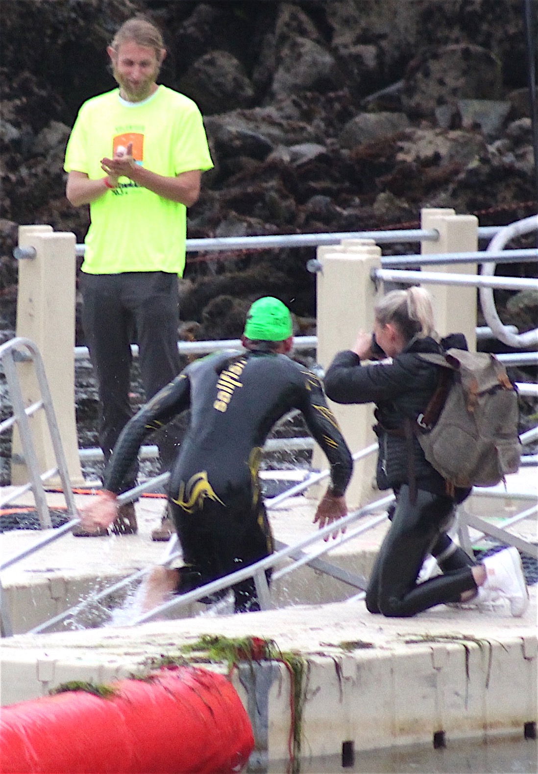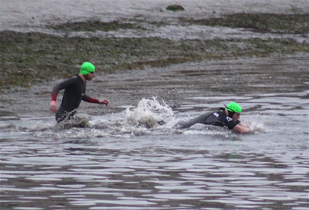 The swim course led the athletes from Coleman Beach, south along the waterfront to a turn-around point near Rose's Landing and then back, turning left towards Target Rock. A set of floating finger docks channel swimmers to a ramp that took them up through the rocks to the finish line.