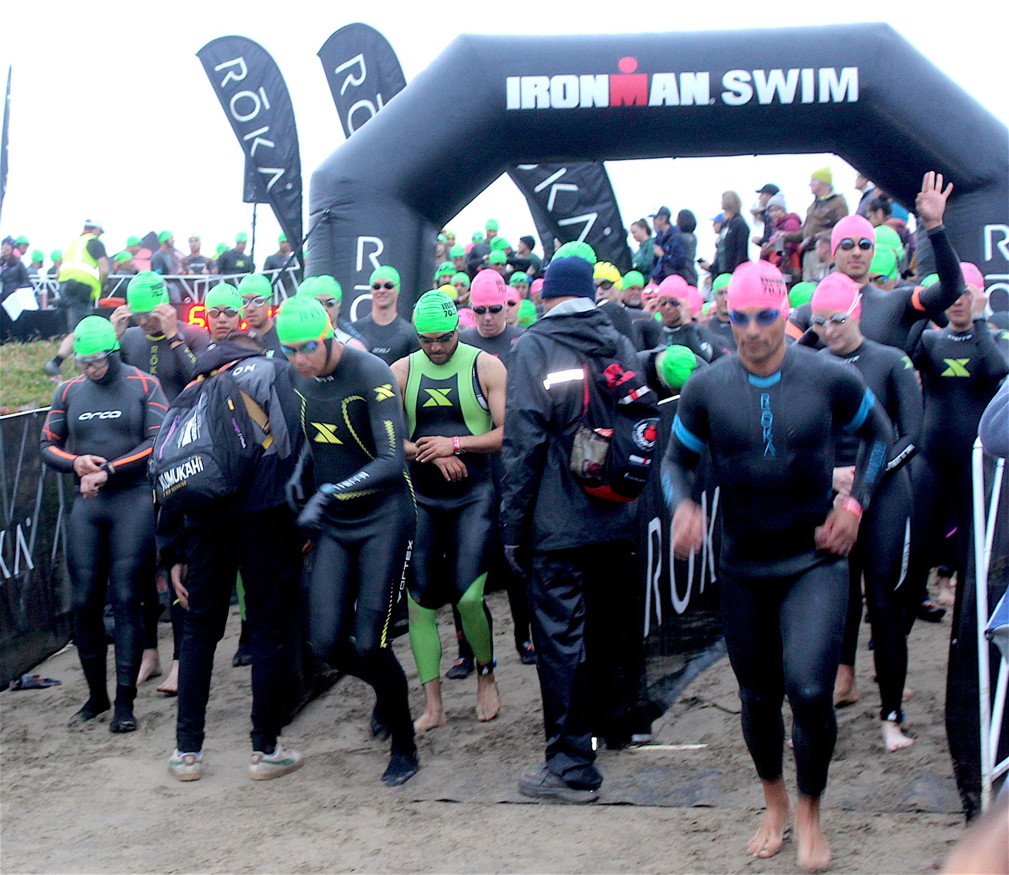 There were so many athletes they started the swim three at a time, every 10 seconds, for well over an hour. Swimmers started hitting the Bay at 6 a.m. And despite the electronic timing devices each wore to track their progress through the swim-bike-run course, most also had a wristwatch timer.