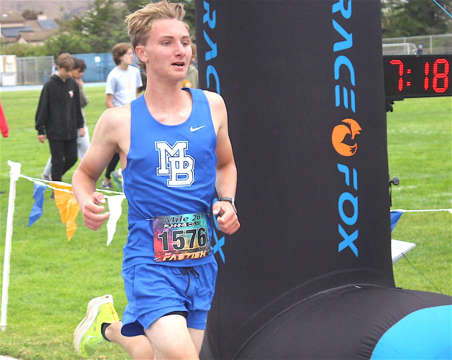 MBHS' No. 2 boys varsity runner, Abe Gade, crosses the finish line in 16th place.