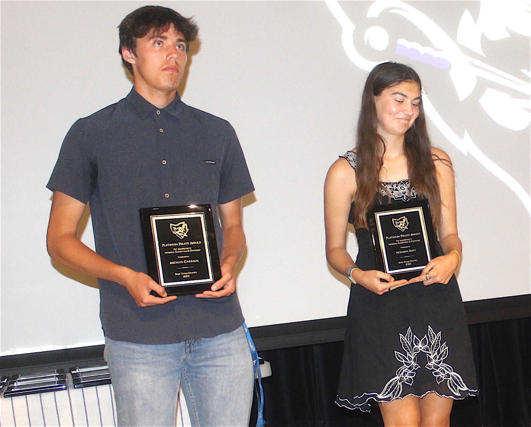 Michael Carbajal (left) and Noleena Fahy received Platinum Pirate Awards for their contributions to the MBHS cross country teams.