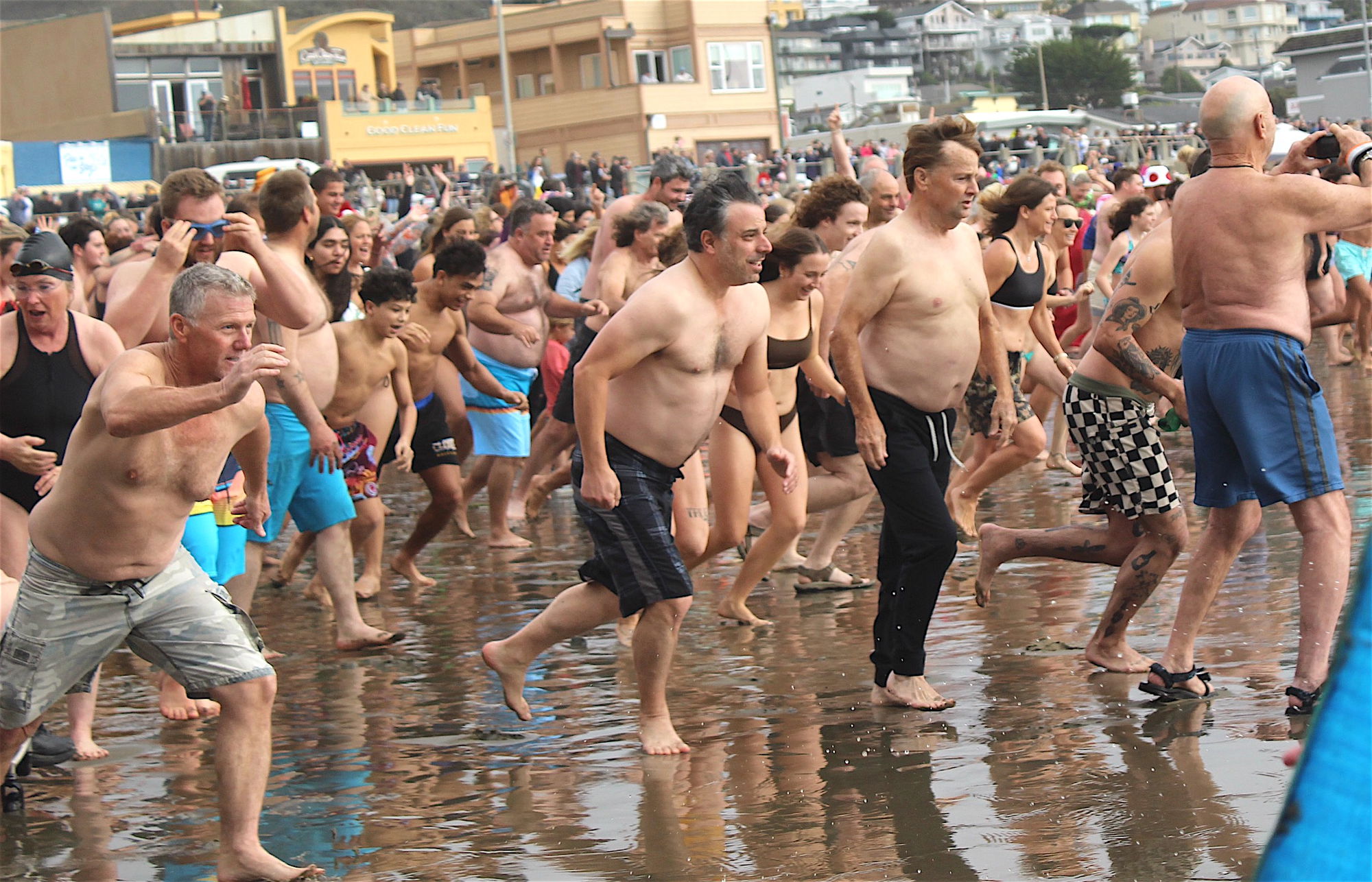 Hundreds of people lined the Cayucos Pier5 to watch an estimated 3,000-plus Polar Bear Dippers rush the waves to wash away 2025 and welcome in 2026.