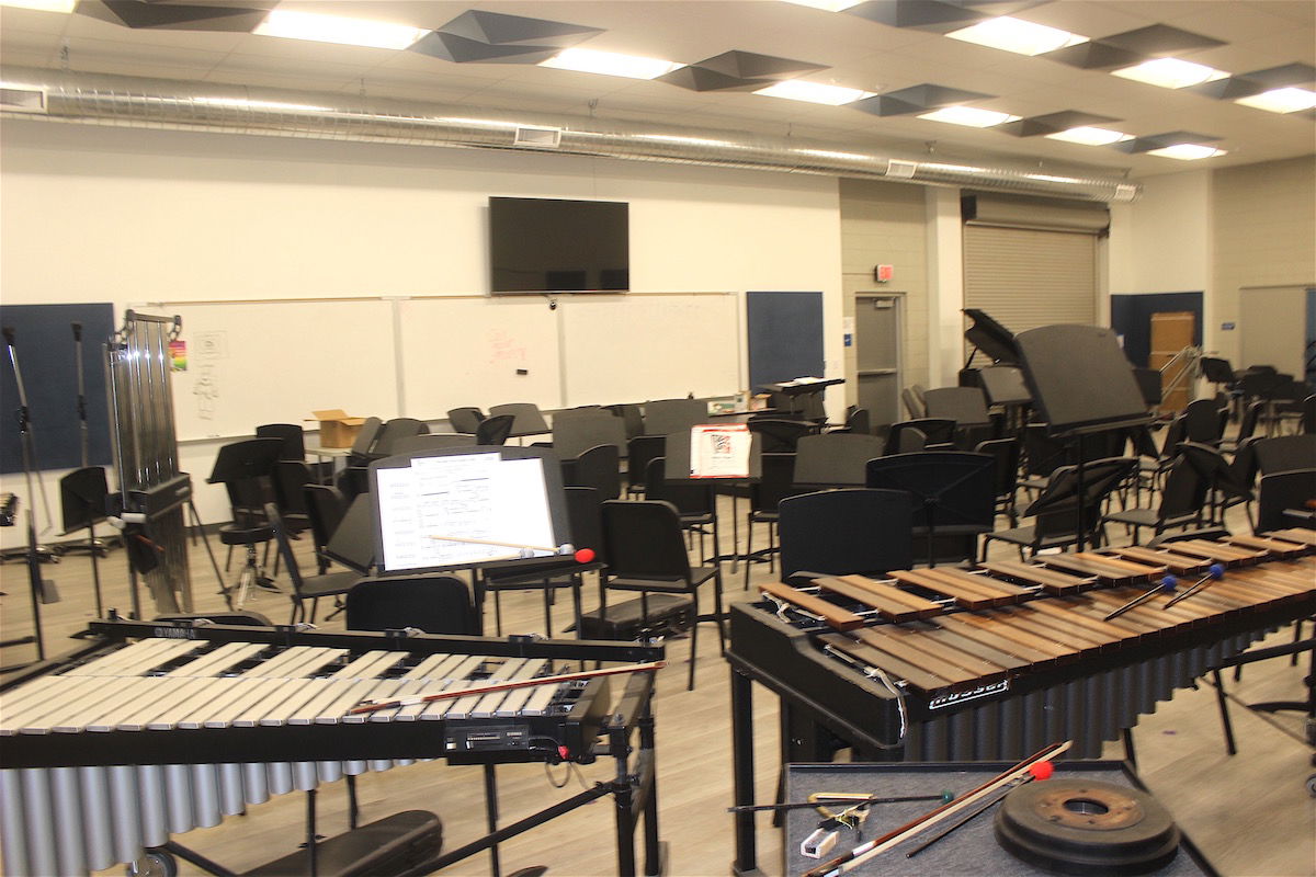 The spacious band room includes a grand piano, drum kits, timpani, xylophone, and lots of room for the school's various band ensembles, their music stands, and seating.