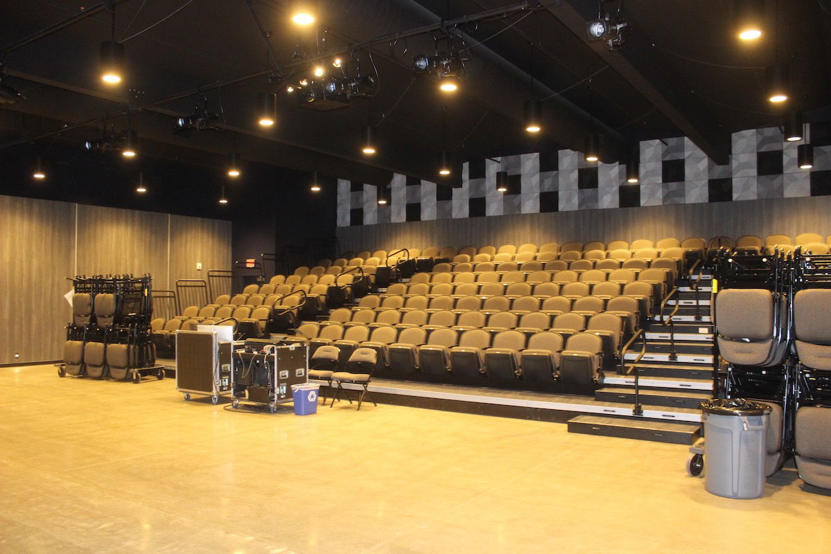 Schalde explains that the stage is big enough for the full concert band to perform. The seats roll back like bleachers in a gym and the lights and sound gear are state-of-the-art. He's almost giddy at the fantastic space that they'd only gotten the keys to less than a month before.