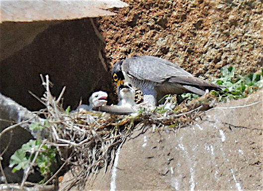 The Watchers, led by Bob Isenberg, stand vigil on a daily basis (weather permitting), watching the protected falcons as they build nests, hatch chicks, and feed the hungry little mouths with birds snatched right out of the air.